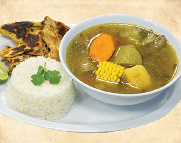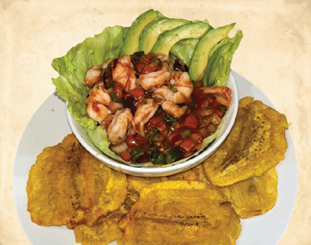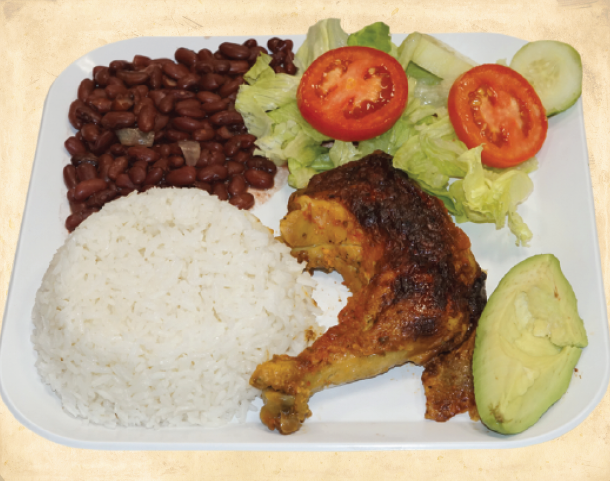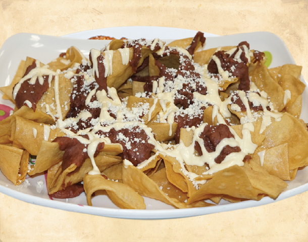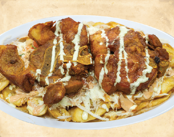 Platano maduro, salchicha, aguacate, frijol frito, queso y crema